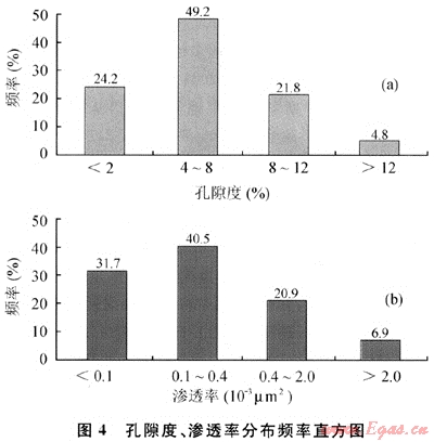 據(jù)大量樣品統(tǒng)計,孔隙度、滲透率變化較大:孔隙度為0.8%~20.2%,其中孔隙度為4%~8%的樣品占49.2%,孔隙度為8%~12%的樣品占21.8%,大于12%的樣品占4.8%;滲透率為(0.01~2755)×10-3μm2,其中滲透率為(0.1~0.4)×10-3μm2的樣品占40.5%,(0.4~2)×10-3μm2的樣品占20.9%,滲透率大于2×10-3μm2的樣品僅占6.9%(圖4)。