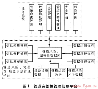 管道完整性管理信息平臺(tái)根據(jù)相關(guān)的數(shù)據(jù)組織、維護(hù)、管理標(biāo)準(zhǔn)建立管道風(fēng)險(xiǎn)、完整性數(shù)據(jù)庫,同時(shí)具備信息的采集整理、分析處理和發(fā)布輸出功能。數(shù)據(jù)庫包括設(shè)備設(shè)施數(shù)據(jù)、管道運(yùn)營數(shù)據(jù)和管道風(fēng)險(xiǎn)相關(guān)數(shù)據(jù)。管道業(yè)務(wù)系統(tǒng)包括管道數(shù)據(jù)評(píng)價(jià)、數(shù)據(jù)信息管理、應(yīng)急管理、管道完整性管理、安全評(píng)價(jià)、風(fēng)險(xiǎn)評(píng)價(jià)等子系統(tǒng),通過GIS共享管道風(fēng)險(xiǎn)、完整性數(shù)據(jù)庫,實(shí)現(xiàn)信息的共享、交互、集成。由于管道完整性管理系統(tǒng)是個(gè)較復(fù)雜的系統(tǒng),一方面必須從技術(shù)層面上進(jìn)行信息數(shù)據(jù)的分析、資源優(yōu)化分析處理、信息輸出來實(shí)現(xiàn)空間數(shù)據(jù)的共享、融合,另一方面須建立一套完整的風(fēng)險(xiǎn)、完整性與應(yīng)急數(shù)據(jù)組織標(biāo)準(zhǔn)、數(shù)據(jù)維護(hù)標(biāo)準(zhǔn)、數(shù)據(jù)管理標(biāo)準(zhǔn)來保證系統(tǒng)平臺(tái)的正常運(yùn)行。只有經(jīng)過技術(shù)層面和體制層面的整合,在合理的范圍內(nèi)實(shí)現(xiàn)信息和資源的充分共享,才能使天然氣管道完整性管理系統(tǒng)達(dá)到最大的使用效益。