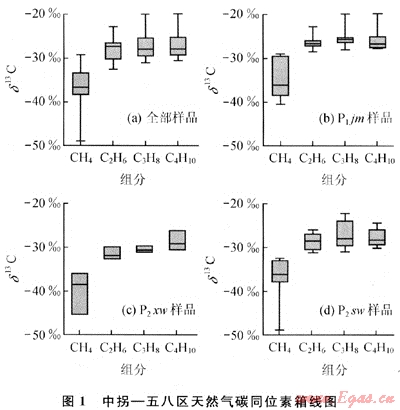 研究區(qū)天然氣甲烷碳同位素值多小于-30‰,主要為-38.51‰~-33.44%。,平均值為-36.83‰。乙烷、丙烷和丁烷的碳同位素值明顯偏重,其中,乙烷碳同位素值為-32.59‰~ -22.98‰;丙烷碳同位素值為-31.18‰~-20.12‰;丁烷的碳同位素值為-30.64‰~-20.02‰(圖1-a)??傮w上看來(lái),研究區(qū)內(nèi)天然氣樣品均具正碳同位素系列的特征(部分發(fā)生輕微倒轉(zhuǎn)),應(yīng)為有機(jī)成因氣[8~10],部分樣品發(fā)生輕微倒轉(zhuǎn)的原因可能主要在于有少量不同來(lái)源或不同成熟度的天然氣混入。各層組之間天然氣的穩(wěn)定碳同位素值存在差異,佳木河組和上烏爾禾組天然氣甲烷碳同位素值變化范圍相對(duì)較大,且碳同位素系列有倒轉(zhuǎn)現(xiàn)象,反映來(lái)源具有多樣性(圖1-b和圖1-d);下烏爾禾組天然氣甲烷碳同位素值分布范圍較小,且明顯偏輕,烷烴氣碳同位素值呈正碳同位素系列分布特征,反映來(lái)源單一(圖1-c)。