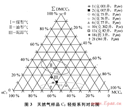 此外,利用C7輕烴系列化合物和烷烴碳同位素值[13~15]也可有效判別天然氣成因類(lèi)型。如圖3所示,天然氣樣品明顯呈3個(gè)點(diǎn)群分布:Ⅰ類(lèi)甲基環(huán)己烷(MCC6)含量相對(duì)較高,二甲基環(huán)戊烷(DMCC5)含量低(小于10%),為典型的煤型氣;Ⅱ類(lèi)二甲基環(huán)戊烷的相對(duì)含量則有明顯增高(大于20%),屬油型氣;Ⅲ類(lèi)C7輕烴系列的相對(duì)含量介于Ⅰ類(lèi)和Ⅱ類(lèi)之間,為油型氣和煤型氣的混源氣。