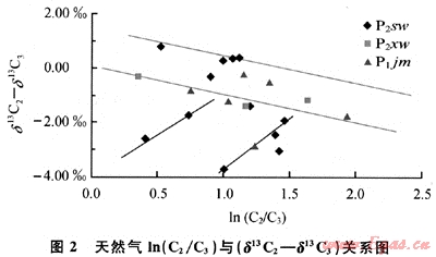 與干酪根初次裂解氣相比,原油二次裂解氣以C3的遞減速率高為特征。因此,利用(δ12C2-δ13C3)值與ln(C2/C3)值相關(guān)關(guān)系可有效區(qū)分干酪根初次裂解氣和原油二次裂解氣[11~12]。據(jù)此可判斷下烏爾禾組天然氣均為原油二次裂解成因氣,而佳木河組和上烏爾禾組天然氣成因類(lèi)型相對(duì)多樣,既有干酪根初次裂解成因天然氣,也有原油二次裂解成因氣,同時(shí)也可能存在二者混合氣(圖2)。