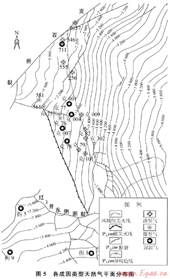 不同類(lèi)型天然氣在平面上呈條帶狀分布(圖5)。油型氣主要沿風(fēng)城組尖滅線(xiàn)分布,該處緊鄰風(fēng)城組烴源巖,油型氣供給充足。混源氣均分布于風(fēng)城組尖滅線(xiàn)以外的區(qū)域,該區(qū)域?yàn)榧涯竞咏M烴源巖的主要分布區(qū),同時(shí)也是風(fēng)城組烴源巖排烴的有利指向區(qū),易于煤型氣與油型氣發(fā)生混合。佳木河組內(nèi)部的煤型氣由于為自生自?xún)?chǔ)成因,分布相對(duì)廣泛;而上烏爾禾組煤型氣均集中分布在五區(qū)南斷裂附近,該斷裂為斷至佳木河組內(nèi)部的斷源斷裂,表明斷源斷裂是佳木河組烴源巖垂向排烴的優(yōu)勢(shì)通道。