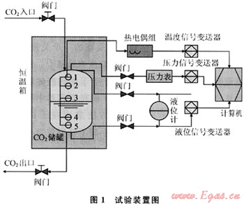 由于LNG的危險性,直接進行大容量LNG儲罐的試驗非常困難,而模擬的理論基礎是氣液相平衡原理,對于各種尺度LNG儲罐都是適用的。因此本試驗采用小型儲罐,用C02介質(zhì)代替LNG進行低溫液體蒸發(fā)率試驗,測試該低溫液體儲罐靜態(tài)蒸發(fā)率,通過試驗來驗證模型的準確性,然后用研制并完善的模型來研究大尺度的LNG儲罐內(nèi)的蒸發(fā)規(guī)律[12]。