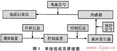 圖1是整個系統(tǒng)的組成及工作原理圖。整個系統(tǒng)的工作原理是:井下儀器的測量裝置測得的井斜信息通過一定的機構(gòu)傳遞給控制裝置,控制裝置將井斜信息轉(zhuǎn)換為控制信息,從而控制脈沖發(fā)生器產(chǎn)生脈沖信號,脈沖信號通過鉆井液傳遞到地面,立管上的傳感器檢測到壓力脈沖信號并由地面記錄儀打印出來,并根據(jù)脈沖信號的數(shù)量顯示出井斜的大小。