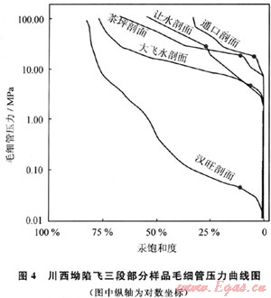 對上述8個剖面(圖1)的飛三段35個砂屑鮞粒結構石灰?guī)r(白云巖)樣品的孔隙度進行了測試。結果顯示,孔隙度平均值為2.39%(圖3),高于四川盆地碳酸鹽巖有效儲集巖評價標準的孔隙度下限值(下限值為2%,參照SY/T 6110-2002碳酸鹽儲集巖級別劃分和四川碳酸鹽巖儲集巖分類方法),暗示該區(qū)飛三段砂屑鮞粒碳酸鹽巖為重要的潛在儲集巖。然而,孔隙度范圍變化較大(0.18%~16.98%),顯示樣品的非均質性較強,如北段南部通口等剖面的砂屑鮞粒碳酸鹽巖孔隙度平均值多低于1%(圖3),孔隙結構為小孔微喉或微孔微喉型組合,毛細管壓力曲線特征顯示出細-極細歪度,分選差極差(圖4),顯微鏡下觀察也顯示,這些剖面樣品的亮晶方解石膠結作用非常發(fā)育,應是孔隙度降低的重要原因;而在漢旺剖面飛三段上亞段,見有粒間溶孔發(fā)育的鮞粒白云巖,孔隙度最大值可達16.71%,孔隙結構為大孔中粗喉,毛細管壓力顯示出略粗歪度,分選差的特征(圖4),可能為不均勻溶蝕作用的結果;南段大飛水剖面的4個樣品孔隙度平均為8.23%(圖3),巖性為重結晶殘余砂屑鮞粒細晶白云巖,孔隙類型主要為白云石晶間(溶)孔,孔隙結構為中孔細喉,毛細管壓力曲線顯示出分選好,細歪度的特征(圖4),儲集性能為中等-差。