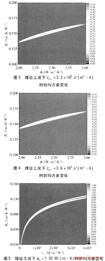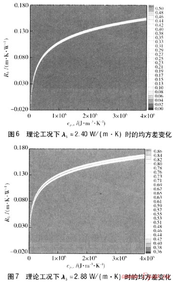 運用參數(shù)估計法,給λs賦值:1.92、2.40、2.88W/(m·K),在參數(shù)估計中,分別對cp,s、Rb在一定的取值范圍內(nèi)連續(xù)賦值。通過計算機編程計算得到模擬工況下的均方差變化情況見圖12~14,圖右側色標為均方差。由圖12~14可知,模擬工況下的結果不理想,均方誤差較小的淺色云圖中深色區(qū)域對應多組cp,s、Rb,這樣就很難確定哪組數(shù)值是最優(yōu)值,即在參數(shù)估計中對其他參數(shù)的影響比較大。