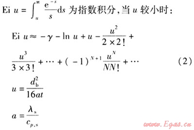 地埋管換熱器的傳熱模型主要有線熱源模型、柱熱源模型。線熱源模型是基于1948年Ingersoll和Plass等人發(fā)展的Kelvin線熱源理論[8]。工程上常見的地埋管換熱器的直徑一般為26~36mm,鉆孔深度為40~200m,與鉆孔深度相比,地埋管的直徑很小。在地埋管換熱器工作時,相當于在半無限大介質中,鉆孔中心的一根線熱源與周圍巖土進行熱交換。另外,假設沿地埋管長度方向傳熱量忽略不計,周圍巖土均勻且線熱源與巖土的傳熱量恒定。由于該方法不受具體換熱器形式的限制,計算較簡單,且能滿足一般工程中土壤源熱泵系統(tǒng)設計計算的要求,具有較廣泛的實用性。根據(jù)假設,可以得到地埋管內(nèi)流體平均溫度與鉆孔周圍巖土初始平均溫度及其他參數(shù)之間的關系式[9]: