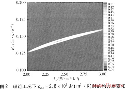 為了減少計算量,本文控制待求熱物性參數(shù)在一定范圍內(nèi)變化,得到相應均方差,并采用Tecplot繪圖,在圖中即可得到均方差最小區(qū)域所對應的待求參數(shù)值。