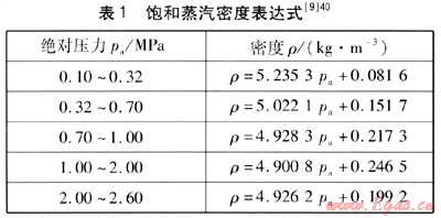 飽和蒸汽不同于理想氣體,不能通過氣體狀態(tài)方程來計算其密度;也不同于過熱蒸汽,不能用以溫度和壓力為自變量的近似公式來計算其密度;只能用以溫度或壓力為自變量的近似公式來計算其密度。以壓力為函數(shù)的飽和蒸汽密度表達式見表1,飽和蒸汽密度表達式在相應(yīng)的壓力范圍內(nèi)精度比較高。