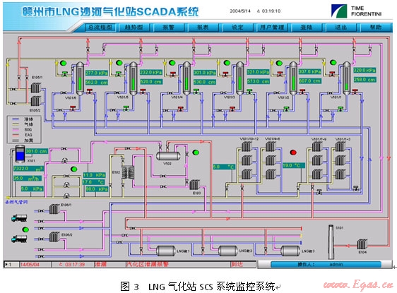 SAE-LSMS系統(tǒng)已成功在國(guó)內(nèi)應(yīng)用多年,2005年深圳美視電廠總管式增壓40kfg,氣化量48,000NM3/H,2007年深圳燃?xì)饧瘓F(tuán)梅林LNG應(yīng)急調(diào)峰站單元式增壓20kfg,氣化量小時(shí)40,000NM3/H,2008年南京港華兩個(gè)2500立方LNG子母罐氣化站均已應(yīng)用該系統(tǒng)。均取得了較好的效果。圖5為廣東潮州子母罐式LNG氣化站SCS系統(tǒng)監(jiān)控畫(huà)面。
