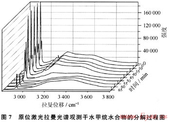 圖5是原位激光拉曼光譜測(cè)定冰融化過(guò)程的譜圖,從該譜圖中可以看到,隨著系統(tǒng)溫度的不斷升高,冰的四面體結(jié)構(gòu)逐漸瓦解,氫鍵數(shù)目逐漸減少,峰包的高波數(shù)側(cè)不斷上揚(yáng),而低波數(shù)端不斷消亡,從該譜圖上看冰的融化過(guò)程幾乎是水結(jié)冰的逆過(guò)程。