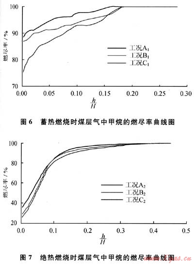 從圖3~5中還可以看出,采用蓄熱式燃燒時,煤層氣中甲烷濃度為5%、4%、3%的最高溫度分別為1270K、1100K、867K,最高溫度分別出現(xiàn)在h/H為0.18、0.19、0.2附近。而h/H為0.2是惰性顆粒形成床層的近似高度,由此可知,最高溫度出現(xiàn)的位置在床層的上部,并隨著煤層氣中甲烷濃度的降低略向上移,這是與煤層氣中甲烷的燃燒位置分不開的。從圖6中可以看出,隨著煤層氣中甲烷濃度的降低,甲烷完全燃盡的位置逐漸向上推移,由此造成在爐膛中出現(xiàn)最高溫度的位置逐漸上移。這是由于隨著煤層氣中甲烷濃度的降低,爐膛的溫度和石英砂顆粒的溫度降低,這樣就推遲了煤層氣中甲烷從點火到完全燃盡所用的時間,在流量一定的情況下,甲烷完全燃盡所出現(xiàn)的位置便向上推移,從而使最高溫度出現(xiàn)的位置向上推移。如圖6所示,在A1、B1、C13種工況下,h/H為0.2位置處,煤層氣中的甲烷燃盡率都接近100%,說明煤層氣中的甲烷在惰性顆粒組成的床層以內(nèi)就基本完成了燃燒反應(yīng)。