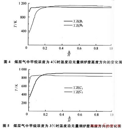 圖3~5分別為煤層氣中甲烷在同一濃度時,蓄熱燃燒和絕熱燃燒兩種不同條件下,爐膛溫度沿高度方向的變化圖示。從圖中可以看出,工況A2、B2、C2為絕熱燃燒,由于采用煤層氣和空氣的混合物常溫進(jìn)入爐膛,在爐膛入口出溫度較低,并隨著高度的增加,溫度逐漸升高,溫度最高點出現(xiàn)在h/H為0.4附近。工況A1、B1、C1采用石英砂蓄熱顆粒,由于石英砂顆粒的存在,使得h/H小于0.2的底部區(qū)域溫度比絕熱燃燒時溫度高,最高溫度點出現(xiàn)在矗/H為0.2附近。圖3為煤層氣中甲烷濃度為5%時,工況A1和A2溫度變化的情況,最高溫差△T3為30K。圖4為煤層氣中甲烷濃度為4%時,工況B1和B2溫度變化的情況,最高溫差△T4為41K。圖5為煤層氣中甲烷濃度為3%時,工況C1和C2溫度變化的情況,最高溫差△T5為52K??梢?,隨著煤層氣中甲烷濃度的增加,絕熱燃燒與蓄熱燃燒的最高溫差逐漸減少。