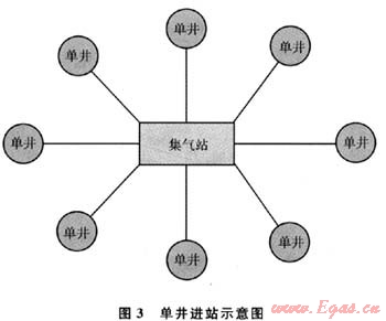 單井進站即每口氣井分別通過各自獨立的采氣管線直接進站,其單井進站示意圖如圖3。此方式是目前在常規(guī)天然氣氣田中應(yīng)用最廣的模式,如長慶氣田、川渝氣田大都采用了單井直接進站的方式。這種進站方式的特點是氣井間相互影響小,適合于高壓高產(chǎn)的單井,但采氣管網(wǎng)距離最長,建設(shè)工程量大,因此,這種方式對于產(chǎn)氣量低、井距小、壓力低且處于山區(qū)復雜條件下的煤層氣井并不適用。
