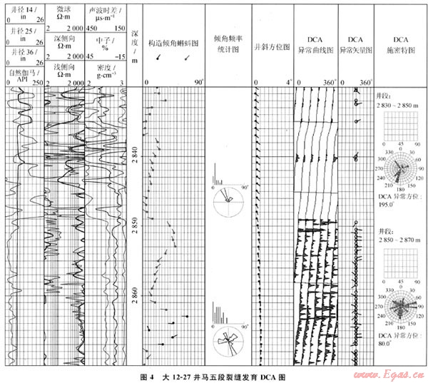 利用地層傾角測井識別裂縫效果較好,電導(dǎo)率異常檢測(DCA)求出由各極板與相鄰兩個極板的電導(dǎo)率的最小正差異,把這個最小正差異疊加在該極板的方位曲線上,作為判斷裂縫的標(biāo)志。DCA成果圖直接顯示出裂縫的方位,排除了由地層層理等引起的電導(dǎo)率異常,突出了與裂縫相關(guān)的電導(dǎo)率異常。
