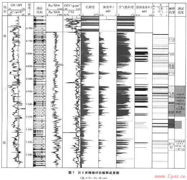 將上述方法得到的定性、定量結(jié)果進行綜合分析評價,并結(jié)合測試結(jié)果,可對儲層進行有效性識別。圖7是川5井綜合評價圖。該井顯示須二段上部儲層物性、天然氣、裂縫匹配關系較好,而含水夾層對應裂縫不發(fā)育段,故解釋該層為氣層,原始狀態(tài)不產(chǎn)水;中上部儲層段有含水夾層且對應裂縫發(fā)育,綜合解釋該層為含水氣層;中下部含氣性差,以含水夾層為主,裂縫發(fā)育,綜合解釋該層為含氣水層;下部以含水層為主,綜合解釋為含水層;底部砂層有一定的裂縫發(fā)育,流體局部含氣,綜合儲層參數(shù)綜合解釋為差氣層。測試時對該井進行了兩次射孔測試,第一次對5157~5180m進行測試,獲天然氣產(chǎn)量8.58×104m3/d;第二次對4925~5045m和5063~5092m進行測試,結(jié)果產(chǎn)水量72.4m3/d,后經(jīng)生產(chǎn)測井證實主產(chǎn)水層為5033~5044m和5073~5091.7m。該井的精細評價結(jié)果得到了很好的地質(zhì)印證[6~7]。