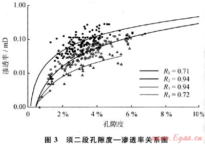 眾所周知,滲透率的大小主要取決于孔隙度的大小和孔隙的幾何形狀,通過對須二段大量的鑄體薄片觀察分類后,建立了與微裂縫發(fā)育程度有關的孔隙度與平均滲透率之間的關系(圖3),其中滲透性最好的是由黑色曲線代表,綠色曲線表示最為致密,橙紅色曲線表示在顯微鏡下可見孔隙連通性較差,未見或有極少微裂縫,喉道發(fā)育差;藍色曲線則代表有少許喉道或微裂縫連通,將測井曲線與之進行綜合標定后,可計算得到不同孔隙結(jié)構(gòu)及裂縫發(fā)育程度下的地層滲透率。