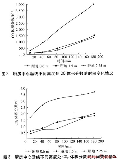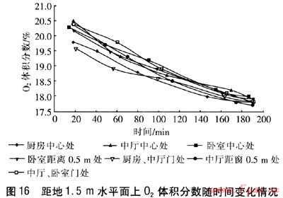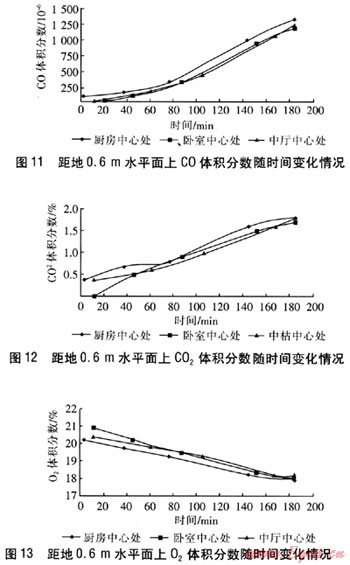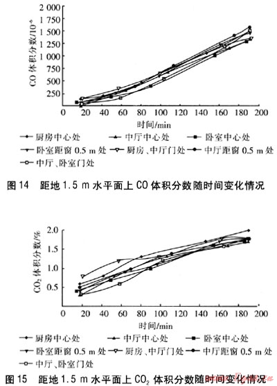 在距地面1.5m水平面上共有7個測點,C0最高體積分?jǐn)?shù)為0.157%,位于中廳距窗0.5m處測點;02最低體積分?jǐn)?shù)為17.7%,位于中廳距窗0.5m處測點;C02最高體積分?jǐn)?shù)為2.0%,位于廚房中心處測點。C0、C02體積分?jǐn)?shù)隨時間的增加呈上升趨勢,02體積分?jǐn)?shù)隨時間的增加而下降。在同一水平面上,室內(nèi)各點的C0、C02體積分?jǐn)?shù)較接近。說明在這一水平面上,煙氣的擴(kuò)散速度較快,各點的污染物體積分?jǐn)?shù)較均勻。