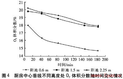 廚房中心垂線上不同高度處的3個測點中,CO最高體積分?jǐn)?shù)為0.4%,02最低體積分?jǐn)?shù)為14.7%,C02最高體積分?jǐn)?shù)為3.7%,均出現(xiàn)在距地2.25m處的測點上。C0、C02體積分?jǐn)?shù)隨時間的增加呈上升趨勢,02體積分?jǐn)?shù)隨時間的增加而下降。這說明隨著燃燒的進(jìn)行,煙氣不斷排放,污染物體積分?jǐn)?shù)逐漸增加,02被不斷消耗。在同一垂線,距地面2.25m處的C0、C02體積分?jǐn)?shù)明顯高于1.5m和0.6m處,這與熱煙氣具有向上浮力和排煙口的位置有關(guān)。