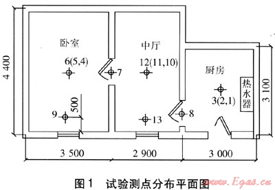 在3個房間內(nèi)共布置了13個測點,測點2、5、11分別位于廚房、臥室和中廳的中心,7、8、9分別位于臥室和中廳門、中廳和廚房門以及臥室靠外窗處,其中測點1、2、3位于同一垂線,4、5、6和10、11、12分別位于同一垂線。測點分布平面圖見圖1,圖中建筑尺寸的單位為mm。同一垂線上的3個點的標(biāo)高分別為0.60m、1.50m、2.25m。熱水器為6L/min直排式燃?xì)鉄崴?,熱?fù)荷為11.4kW,連續(xù)燃燒。