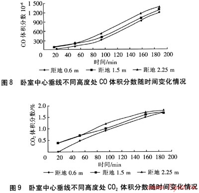 臥室中心垂線上3個測點中,C0最高體積分?jǐn)?shù)為0.138%,02最低體積分?jǐn)?shù)為17.9%,C02最高體積分?jǐn)?shù)為1.8%,均出現(xiàn)在距地2.25m處的測點上。C0、C02體積分?jǐn)?shù)隨時間的增加呈上升趨勢,02體積分?jǐn)?shù)隨時間的增加而下降。在同一垂線,距地面2.25m處的C0、C02體積分?jǐn)?shù)與距地面1.5m和0.6m處較接近,這說明煙氣在垂線位置的體積分?jǐn)?shù)分布已趨于一致。