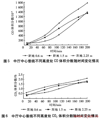 中廳中心垂線上的3個測點中,C0最高體積分?jǐn)?shù)為0.176%,02最低體積分?jǐn)?shù)為17.6%,C02最高體積分?jǐn)?shù)為2.1%,均出現(xiàn)在距地2.25m處的測點上。中廳C0、C02體積分?jǐn)?shù)隨時間的增加呈上升趨勢,02體積分?jǐn)?shù)隨時間的增加而下降。在同一垂線,距地面2.25m處的C0、C02體積分?jǐn)?shù)略高于1.5m和0.6m處,這說明隨煙氣溫度的降低,向上浮力減弱。
