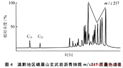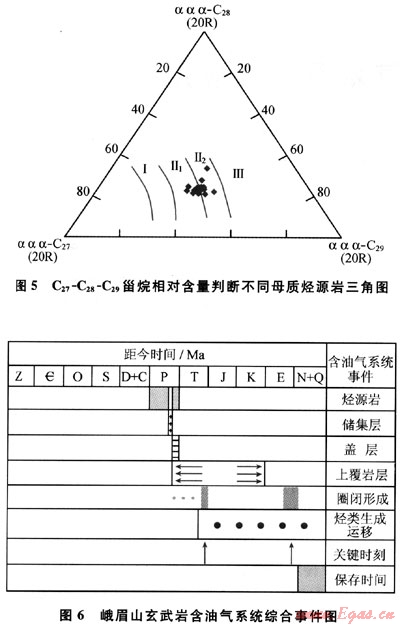 另據(jù)玄武巖瀝青的m/z217質(zhì)量色譜圖(圖4),規(guī)則甾烷呈近“V”字形,C27占優(yōu)勢(shì),反映水生生物輸入有機(jī)質(zhì)較多,利用C27-C28-C29甾烷相對(duì)含量判斷烴源巖母質(zhì)類型(圖5),表明除水生生物外,還有部分腐殖型有機(jī)質(zhì)的輸入;由于上覆的沙灣組在漢王場(chǎng)-青神-犍為-珙縣以東地區(qū),已相變?yōu)楹谏搸r夾薄層石灰?guī)r,有時(shí)可見薄層碳質(zhì)頁巖和煤層[3],故推測(cè)氣源可能有上二疊統(tǒng)煤系地層的貢獻(xiàn)。