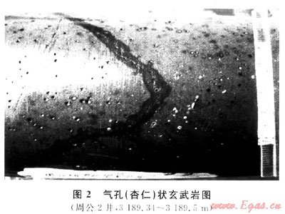 多見于杏仁狀、氣孔(杏仁)狀玄武巖中(圖2),高溫玄武熔巖冷凝時(shí)氣體不斷向上排出,上部熔巖溫度下降快,成巖后使氣體封閉在巖體中形成氣孔;后因熱液作用和重結(jié)晶作用部分氣孔被次生礦物所充填,這種半充填的杏仁和未充填的氣孔是玄武巖原生孔隙的主體,但多是孤立的,需靠裂縫溝通。