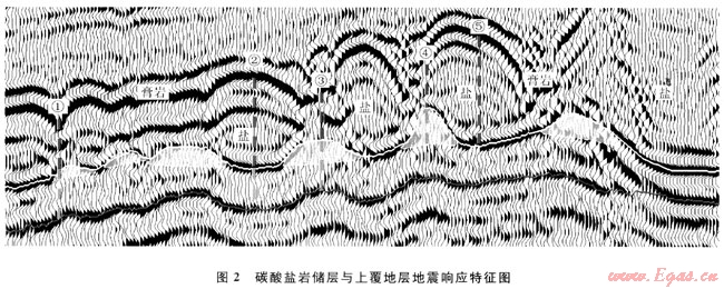 從正演結(jié)果來(lái)看,上覆膏巖的形變與膏鹽巖厚度的變化與鹽下礁體的發(fā)育程度密切相關(guān),膏鹽巖厚度減薄、膏鹽形變劇烈,對(duì)應(yīng)生物礁發(fā)育。礁體地震反射具有丘狀的外形,頂?shù)撞空穹^強(qiáng),內(nèi)部振幅較弱,頂部具有明顯的披覆構(gòu)造,翼部地層超覆于礁體頂界面。礁體發(fā)育區(qū)由于速度低于圍巖速度,還可以引起下伏地層構(gòu)造下拉現(xiàn)象。通過(guò)正演模型的建立,可以分析礁體的響應(yīng)特征,指導(dǎo)礁體識(shí)別。