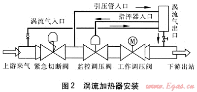 武漢西計(jì)量站來自西氣東輸淮武管道的天然氣壓力為5.0MPa,而下游供氣壓力約為1.4MPa。因此,在調(diào)壓分輸時(shí),存在較大的節(jié)流。調(diào)壓橇采用“緊急切斷閥+監(jiān)控調(diào)壓閥+工作調(diào)壓閥”的調(diào)壓模式。監(jiān)控調(diào)壓閥的指揮執(zhí)行機(jī)構(gòu)主要由預(yù)調(diào)器和指揮器組成,預(yù)調(diào)器和指揮器中均存在節(jié)流。調(diào)壓橇工作時(shí),由于指揮器的出口氣體溫度較低,且天然氣本身含有水或水合物,低溫時(shí)水容易冷凝成冰,堵塞指揮器閥口,造成調(diào)壓橇工作失效。原來主要采取電加熱的方法防止冰堵,現(xiàn)采用雙通道渦流加熱器取代電加熱器。該雙通道渦流加熱器設(shè)計(jì)的工作壓力為6.9MPa,試驗(yàn)壓力為10.3MPa,加熱功率隨上下游壓比的變化而變化。雙通道渦流加熱器可以同時(shí)加熱2路天然氣,即1臺加熱器可以同時(shí)為2臺調(diào)壓閥指揮器加熱。渦流加熱器安裝見圖2。渦流加熱器的渦流氣出口溫度較低,因此渦流氣出口與下游管道之間的連接應(yīng)盡量短,出口管徑盡量大,彎頭盡量少(最好為直管段),以防止出口管道發(fā)生冰堵。在出口處需安裝一個節(jié)流閥來控制渦流氣流量,以控制加熱溫度。在渦流加熱器渦流氣進(jìn)口處安裝一個直徑為12.7mm的小球閥,便于控制渦流加熱器的工作。從上游引壓管引入的高壓天然氣經(jīng)過渦流加熱器加熱后,進(jìn)入調(diào)壓閥指揮器。在指揮器節(jié)流降溫后,天然氣的溫度仍然高于工作狀態(tài)下天然氣的水露點(diǎn),有效地防止了冰堵。渦流加熱器安裝簡單,所有連接處均可采用卡套接頭連接[5]。