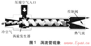 渦流管又稱Ranque Hilsch管,是一個沒有運(yùn)動部件、結(jié)構(gòu)非常簡單的能量分離裝置[1]。氣體在降壓過程中,經(jīng)過特殊設(shè)計(jì)的渦流管時(shí),可以分為冷熱兩股氣流,這種現(xiàn)象稱為渦流管現(xiàn)象,見圖1。