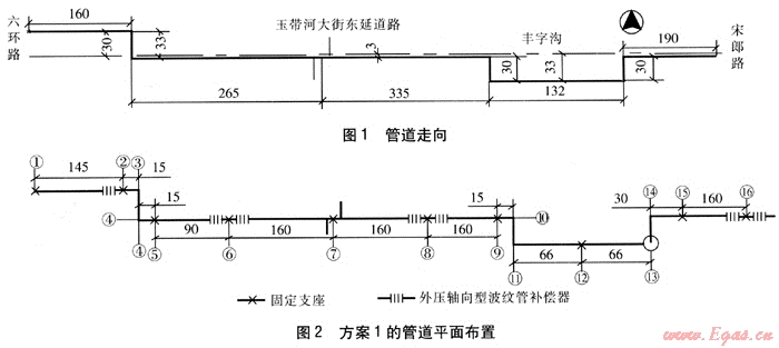 將方案1中節(jié)點1~15與方案2進(jìn)行對比可知,方案1共有固定支座10個,其中2、5、9、15為大推力固定支座,而方案2在平面轉(zhuǎn)角處利用鉸鏈型波紋管補償器,加大補償段長度,并在中間長直管段上利用管道穿越障礙埋設(shè)較深的條件,設(shè)置豎向方形彎利用鉸鏈型波紋管補償器補償直管段熱伸長,減少了大推力固定支座數(shù)量。