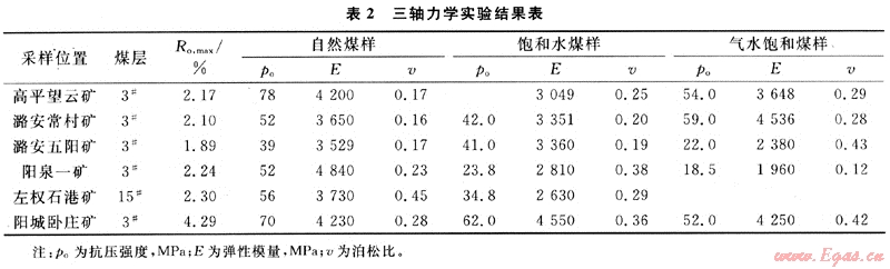 將實(shí)驗(yàn)中得到的軸向應(yīng)變、平均徑向應(yīng)變、軸壓和圍壓代入上兩式,求出每一點(diǎn)的彈性模量和泊松比訓(xùn)。煤樣三軸模擬實(shí)驗(yàn)結(jié)果見(jiàn)表2。