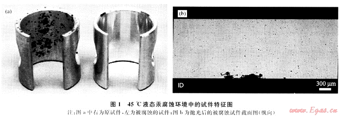 實驗將外徑19.1mm、壁厚1.6mm的6061-T6型鋁無縫管,加工成統(tǒng)一的C形環(huán)狀試件(表面積大約為20cm2,如圖1-a右圖所示);然后在45℃、22℃、O℃的情況下,分別放入液態(tài)汞和汞蒸氣的環(huán)境中進(jìn)行6d的模擬腐蝕實驗。
