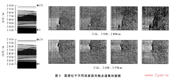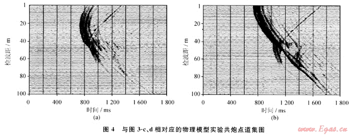 圖3為兩個(gè)楔形模型的射線追蹤圖,比較可以發(fā)現(xiàn),對(duì)于尖滅傾斜層來說,激發(fā)井相對(duì)地層為下傾或接收井相對(duì)地層為上傾時(shí)(圖3-b、圖3-d),其經(jīng)過尖滅傾斜層射線明顯多于上傾激發(fā)或上傾接收(圖3-a、圖3-c)。顯而易見,利用下傾激發(fā)上傾接收的井間資料進(jìn)行偏移成像或?qū)游龀上?,其得到的結(jié)果肯定優(yōu)于上傾激發(fā)下傾接收的結(jié)果。圖4是與圖3-c、3-d對(duì)應(yīng)的物理模型實(shí)驗(yàn)炮集記錄,也表現(xiàn)出同樣的結(jié)果。數(shù)值模擬和物理模擬結(jié)果均表明下傾激發(fā)、上傾接收得到的井間記錄能更好地反映井間介質(zhì)的變化。