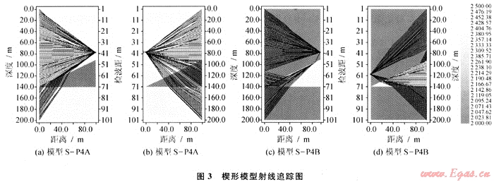 模擬結(jié)果表明,在設(shè)計(jì)井間地震觀測(cè)系統(tǒng)時(shí),應(yīng)當(dāng)力求將射線的入射角控制在臨界角以內(nèi)。同時(shí),為了更好地反映井間介質(zhì)的變化,應(yīng)該采取下傾激發(fā)、上傾接收的方式。因此,物理模型實(shí)驗(yàn)可以為野外井間觀測(cè)系統(tǒng)設(shè)計(jì)提供直觀的依據(jù)。