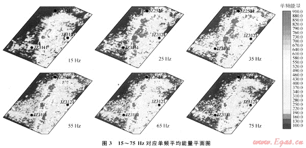 利用基于廣義S變換的頻譜成像儲層預(yù)測技術(shù)對JZ31-6構(gòu)造東二下段北部濁積體開展了研究。利用頻率掃描結(jié)果分析東二下段北部濁積體整體和局部單頻能量強(qiáng)弱的變化,進(jìn)而了解砂體整體和局部特征如厚度、砂體尖滅邊界等。圖3為東二下段北部濁積體從15Hz到75Hz對應(yīng)單頻平均能量的平面圖,顏色越紅表示能量越強(qiáng)。從15Hz到35Hz的分頻平面圖反映出了該濁積體厚層和整體特征;從35Hz到75Hz的分頻平面圖,逐步反映出了砂體薄層和局部特征。35Hz的分頻平面圖比較模糊的地反映出了濁積體由3個局部砂體組成。在更高頻率的分頻平面圖上,更清楚地反映出北部濁積體是由3個局部砂體組成的。這一預(yù)測結(jié)果已被后來鉆井所證實(shí)。