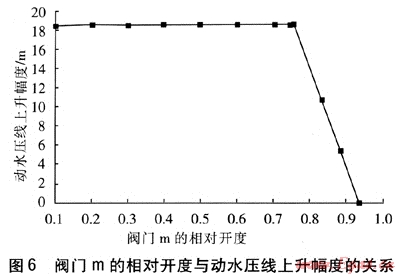 要升高系統(tǒng)動水壓線,必須關(guān)小閥門m或開大閥門n。以圖4為基準(zhǔn),此時閥門n全開,閥門m相對開度為0.931,動水壓線要上升只能關(guān)小閥門m。隨著閥門m關(guān)小,定壓點壓力下降,補水泵向系統(tǒng)補水,系統(tǒng)動水壓上升,直到達到圖3中的動水壓線,此時補水泵強行關(guān)閉。在此過程中,閥門m的相對開度與動水壓線上升幅度關(guān)系見圖6。由圖6可知,以閥門m相對開度0.931時為基準(zhǔn),關(guān)小閥門m,隨著系統(tǒng)補水,動水壓線上升。當(dāng)閥門m相對開度減小到0.750時,動水壓線上升至圖3的上限,此時補水泵強行關(guān)閉,閥門m繼續(xù)關(guān)小,動水壓線也不會上升。