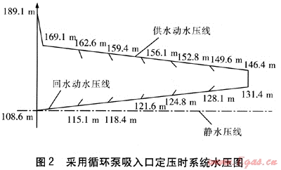 系統(tǒng)水頭損失由熱源、管網(wǎng)、熱力站水頭損失3部分組成。各部分水頭損失為[1~2]:熱源20m;管網(wǎng)水頭損失包括沿程和局部水頭損失,經(jīng)濟比摩阻取50Pa/m,局部水頭損失按沿程水頭損失的30%計算;熱力站的水頭損失為15m。經(jīng)計算,系統(tǒng)水頭損失為80.5m。當(dāng)采用常規(guī)的循環(huán)泵吸入口定壓時,系統(tǒng)水壓圖見圖2。