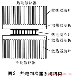 熱電制冷器冷熱端均采用鋁制散熱器進(jìn)行換熱,系統(tǒng)結(jié)構(gòu)見圖2,散熱器由基板和肋片構(gòu)成,基板長(zhǎng)×寬×厚為75mm×63mm×8mm,肋片為等截面矩形直肋,肋長(zhǎng)L=75mm、肋高h(yuǎn)=32mm、肋厚d=1.2mm、肋間距r=1.9mm,肋片數(shù)n=21。熱電制冷片與散熱器基板連接面涂抹導(dǎo)熱硅脂,以減小接觸熱阻。