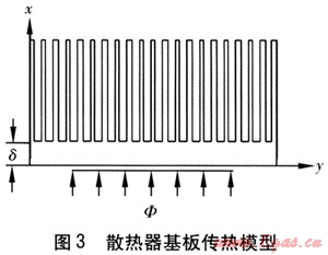 ① 散熱器基板長(zhǎng)、寬尺寸遠(yuǎn)大于厚度尺寸,且四周為絕熱,因此基板可視為一維穩(wěn)態(tài)導(dǎo)熱,基板傳熱模型見圖3。