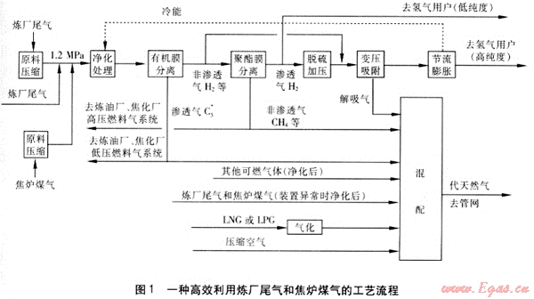 許多城市的煉油廠都與燃氣生產(chǎn)企業(yè)為鄰,甚至雙方已經(jīng)形成了良好的合作關系,附近有城市燃氣管網(wǎng),鋼鐵生產(chǎn)企業(yè)也可能與此距離不遠。照此看來,如果能將鋼鐵企業(yè)、石化企業(yè)與燃氣企業(yè)聯(lián)合起來,在兼顧各方利益的前提下,采用經(jīng)濟的方式首先提取煉廠尾氣和焦爐煤氣中的氫氣組分就近利用,之后將其他所有剩余氣體經(jīng)過簡單處理后制成符合要求的代天然氣產(chǎn)品供應城市燃氣管網(wǎng),那么,聯(lián)合體各方就會各得其所,實現(xiàn)優(yōu)勢互補,互利互惠。在合作各方獲取效益的基礎上,同時使能源利用價值達到最高化,圓滿解決煉廠尾氣和焦爐煤氣中各組分物盡其用的問題。
