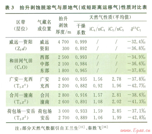 喜山期地層強(qiáng)烈抬升與剝蝕并產(chǎn)生水溶氣的脫溶作用進(jìn)而形成大氣田的實(shí)例,在國內(nèi)外都有發(fā)現(xiàn)。如西西伯利亞盆地上白堊統(tǒng)烏連戈伊氣田[31-32]、四川盆地威遠(yuǎn)震旦系氣田[14-15]、四川盆地中部須家河組氣田[33-34]、塔里木盆地和田河氣田[10,35-36]等。這種水溶氣脫溶作用形成的天然氣田,其地質(zhì)效應(yīng)主要表現(xiàn)在天然氣組分變化與碳同位素值的變化上。具體而言,其主要地質(zhì)現(xiàn)象是氣藏底部或側(cè)翼水體巨大(或圈閉大而充滿度低),產(chǎn)生的地質(zhì)效應(yīng)是甲烷含量高(或干燥系數(shù)大)、異構(gòu)烷烴增加、富集重碳同位素、存在側(cè)向運(yùn)移效應(yīng)等。