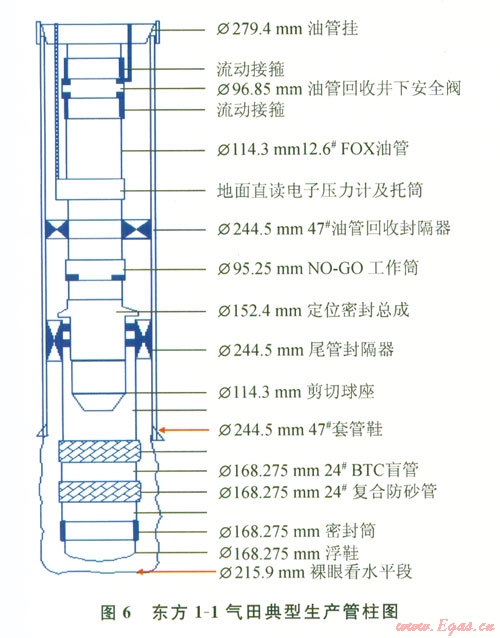 東方l-1氣田具有高產(chǎn)、C02含量較高的特點(diǎn)。作為中海油自營(yíng)開(kāi)發(fā)的首個(gè)氣田在開(kāi)發(fā)所面臨的最大問(wèn)題就是安全開(kāi)發(fā)問(wèn)題。作為安全生產(chǎn)的第一屏障生產(chǎn)管柱結(jié)構(gòu)的設(shè)計(jì)選擇尤其重要。生產(chǎn)管柱的設(shè)計(jì)和下人須滿足低壓力損耗,使用壽命長(zhǎng),滿足氣藏動(dòng)態(tài)監(jiān)測(cè)的要求[2]。油管選用強(qiáng)度高、密封性好、內(nèi)孔平滑和可多次重復(fù)上扣l3Cr FOX油管。上部設(shè)計(jì)井下安全閥,保證氣井在緊急狀況下安全可靠關(guān)閉,及時(shí)切斷氣源。安全閥為全金屬密封(氣密封)。采用雙封隔器結(jié)構(gòu)保證安全生產(chǎn)的需要,增加封隔油套管環(huán)空的可靠性,降低完井作業(yè)返工率:第一密封由插人密封總成與防砂尾管懸掛封隔器組成,第二密封為油管回收封隔器。管柱底部用液壓剪切坐封球座,避免在大斜度井鋼絲作業(yè)坐封封隔器(圖6)。