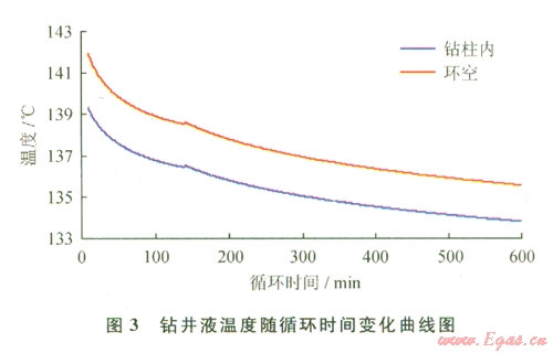 由圖3可知,鉆井液溫度隨循環(huán)時間的增加逐漸降低。當循環(huán)時間約140 min時,鉆柱內(nèi)和環(huán)空鉆井液溫度出現(xiàn)拐點,這是由鉆井液和地層問熱傳遞發(fā)生交換造成的。
