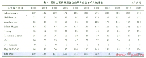 國(guó)際錄井行業(yè)長(zhǎng)期以來(lái)是一個(gè)多頭競(jìng)爭(zhēng)行業(yè),主要有斯倫貝謝(Schlumberger)、貝克休斯(Baker Huges)、哈里伯頓(Halliburton)、納伯斯(Nabors Industries)、威德福(Weatherford)等。由于錄井行業(yè)技術(shù)門(mén)檻低、投入少、風(fēng)險(xiǎn)低,小公司進(jìn)入比較容易,因此競(jìng)爭(zhēng)比較激烈。另一方面,大的油田服務(wù)公司主要側(cè)重于鉆井、隨鉆測(cè)井、鉆井液、電纜測(cè)井、連續(xù)油管等高利潤(rùn)行業(yè),沒(méi)有把發(fā)展重點(diǎn)投向錄井行業(yè),因此沒(méi)有形成個(gè)別公司絕對(duì)控制的局面,市場(chǎng)份額也比較分散(見(jiàn)表1,市場(chǎng)總額中不包含中國(guó)錄井企業(yè)的國(guó)內(nèi)產(chǎn)值,2010年約50億元人民幣)。