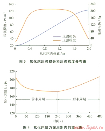 2)在任意周期內(nèi),氧化床阻力在前半周期內(nèi)隨時間增加而不斷降低,進入后半周期后,氧化床阻力開始回升,到后半周期結(jié)束時恢復到該周期開始時的阻力值;氧化床阻力隨著氣流方向的周期改變以v型波的形式呈現(xiàn)周期性變化。