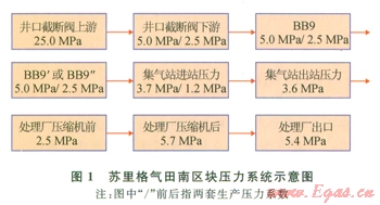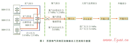 BB9'或BB9〞井叢9口氣井原料氣經(jīng)井下節(jié)流后,通過(guò)孔板流量計(jì)連續(xù)計(jì)量,與該井叢另外8口氣井的天然氣匯集后,與附近3座或2座BB9井叢輸來(lái)的原料氣匯合后輸至本區(qū)塊集氣站。