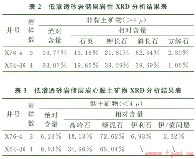首先對(duì)實(shí)驗(yàn)巖心樣品進(jìn)行XRD分析,其結(jié)果見(jiàn)表2、3??梢钥闯觯簬r石骨架部分以長(zhǎng)石為主,石英含量次之;黏土礦物含量較少,以綠泥石為主,綠泥石含量在50.0%~75.30%之間。