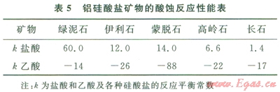 有學(xué)者研究了鹽酸與各種鋁硅酸鹽礦物的反應(yīng)動(dòng)力學(xué),并將反應(yīng)速度常數(shù)的對(duì)數(shù)值為50時(shí)對(duì)應(yīng)的溫度(T50)作為各種鋁硅酸鹽在鹽酸中保持穩(wěn)定的溫度上限,各種鋁硅酸鹽的T50值如表5所示。表5同時(shí)也給出了根據(jù)熱力學(xué)數(shù)據(jù)計(jì)算出來(lái)的鹽酸與醋酸與各種鋁硅酸鹽礦物反應(yīng)的平衡常數(shù)??梢钥闯?,在熱力學(xué)上,這些鋁硅酸鹽均可以溶于鹽酸,但幾乎完全不溶于醋酸;而在動(dòng)力學(xué)上,沸石在鹽酸中最不穩(wěn)定,綠泥石次之,長(zhǎng)石最穩(wěn)定。在儲(chǔ)層中占優(yōu)勢(shì)的鋁硅酸鹽礦物的T50低于儲(chǔ)層溫度時(shí),應(yīng)該考慮在酸化液中用乙酸代替鹽酸[6-8]。